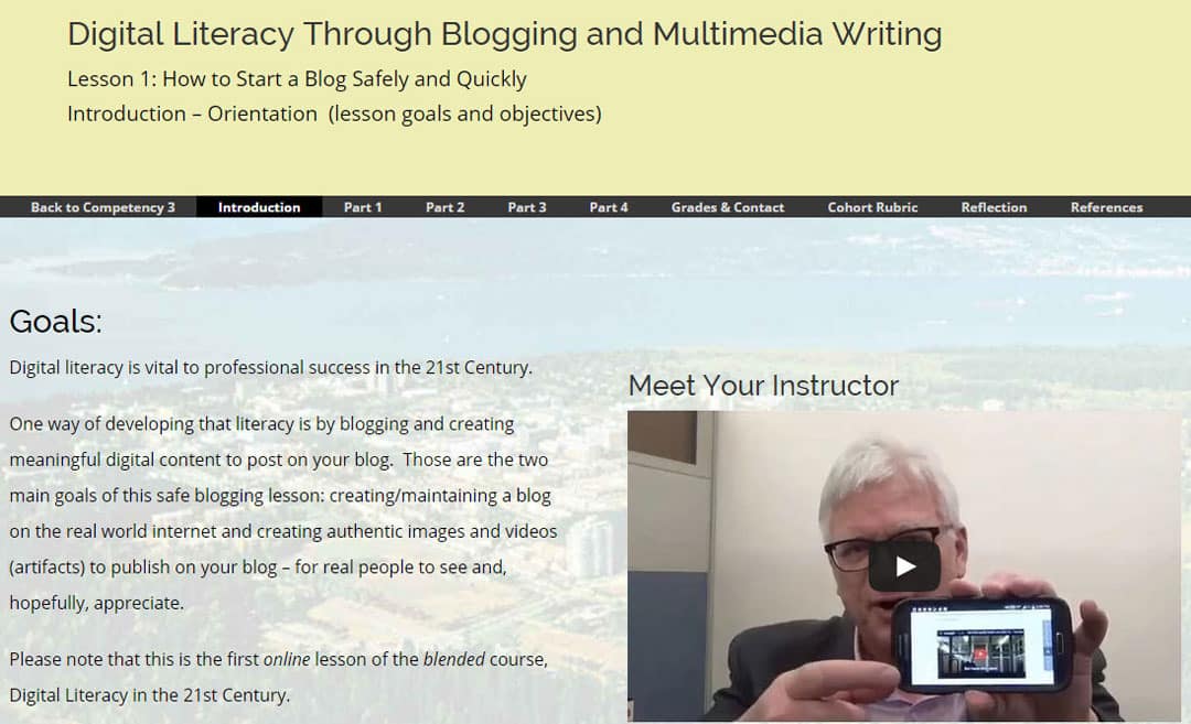 Because the assignment called for the development of an online instructional/workshop lesson that included about 1 hour of instruction, I did have to make some changes in a few areas, though. For example, the self-introduction was put on video and I eliminated many administrative aspects of the real-life course’s first two weeks (such as setting up students on Gmail and a learning management system) in order to focus on the most essential elements of the course curriculum: developing digital literacy through blogging, photography, writing, and filmmaking.
